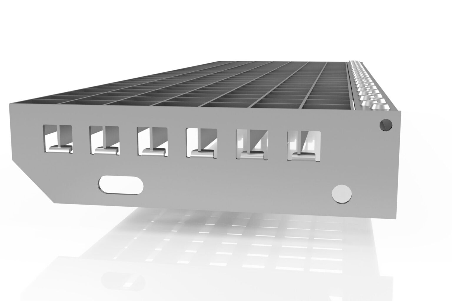 Panels welded to the sides of steps with holes for screwing to a stair stringer.