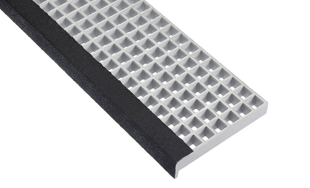 Die GFK-Stufen bestehen aus unseren GFK-Gitterrosten an die ein geschlossener, besandeter und schwarz eingefärbter GFK-Antrittswinkel oder ein schwarz besandetes GFK-Flachmaterial, laminiert wird.  In der Regel geschieht dies mit einem 38 mm hohen GFK-Gitterrost. Der Antrittswinkel dient als Verstärkung der Stufe im Antrittsbereich, das Flachmaterial lediglich als Sichtkante. Auf Anfrage werden GFK-Auflagerwinkel 75x75x8 mm für die Stufen mit seitlichen Bohrungen als Seitenplatten mitgeliefert. Diese werden mittels Direktverschraubung mit der Stufe verbunden.